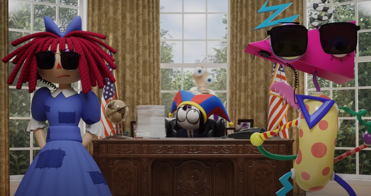 Then they do this skit where Pomni is the President of the United States, and it’s just dead time. It lasts for two minutes and doesn’t really serve any purpose. Now, the point of a character-driven show is that, often, you can place your characters into any scenario and the audience can enjoy how the characters react to that scenario. However, that would require having strong characters with really firm personalities, which Digital Circus does not have. Unfortunately, when Pomni is the president, she just does what she always does – she asks why she’s there, asks what she’s supposed to be doing, vaguely resists doing any of it, and that’s it.